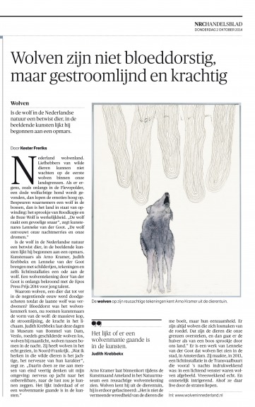 Nederland wolvenland. Liefhebbers van wilde dieren kunnen niet wachten op de eerste wolven binnen onze landsgrenzen. Als er ergens, zoals onlangs in de Flevopolder, een dode wolfachtige hond wordt ge-vonden, dan lopen de emoties hoog op. Bespeuren waarnemers een wolf in de bossen, dan is het land in staat van op-winding: het sprookje van Roodkapje en de Boze Wolf is werkelijkheid. „De wolf raakt een gevoelige snaar", zegt kunstenares Lenneke van der Goot. „De wolf ontvouwt onze nachtmerries en onze dromen." Is de wolf in de Nederlandse natuur een betwist dier, in de beeldende kunsten lijkt hij begonnen aan een opmars. Kunstenaars als Arno Kramer, Judith Krebbekx en Lenneke van der Goot brengen met schilderijen, tekeningen en zelfs lichtinstallaties een ode aan de wolf. Een wolventekening door Van der Goot is onlangs bekroond met de EposPress Prijs 2014 voor jong talent. Waarom wolven, een dier dat tot ver in de negentiende eeuw werd doodgeschoten totdat de laatste wolf was verdwenen? Bloeddorst was het wolvenkenmerk toen, nu roemen kunstenaars de vorm van de wolf: de massieve kop, de stroomlijning, de kracht in het lichaam. Judith Krebbekx laat deze dagen in Museum van Bommel van Dam, Venlo, roedels geschilderde wolven los, wolven bij maanlicht, wolven tussen bomen in de nacht. Zij heeft wolven in het echt gezien, in Noord-Frankrijk. „Wat ik herken in die wilde dieren is het jachtige, het nerveuze van hun karakter" zegt ze. „Daarin doen ze me aan mensen van eind veertig denken uit mijn omgeving: nerveus op jacht naar het onbereikbare, naar de lust zou je kunnen zeggen. Het lijkt inderdaad of er een wolvenmanie gaande is in de kunsten." Arno Kramer Iaat binnenkort tijdens de Kunstmaand Ameland in het Natuurmuseum een reusachtige wolventekening zien. Wolven kent hij uit de dierentuin, hij is erdoor gefascineerd: „Het is niet de vermeende wreedheid van de dieren die me boeit, maar hun eenzaamheid. Er zijn altijd wolven die zich losmaken van de roedel. Dat zijn de dieren die onze grenzen oversteken, en dan gaat er de huiver als van van een boos sprookje door ons land. Er is een werk van Lenneke van der Goot dat wolven liet zien in de stad, in Amsterdam. Zij maakte, in 2013 een lichtinstallatie in de Transvaalbuurt die vooral 's nachts indrukwekkend was: in een lichtend venster waren wolven afgebeeld. Vreeswekkend echt. En onmetelijk intrigerend. Alsof ze live door de straten liepen.