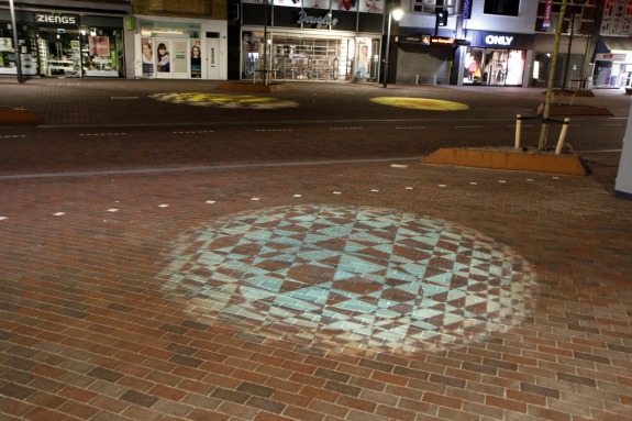 Tijdens haar zoektocht stuit Van der Goot ook op de – onder oudere inwoners van Beverwijik legendarische – tapijtenknoperij Kinheim, rond 1910 gestart door mevrouw Polvliet, geïnspireerd door de technieken en patronen die zij tijdens reizen naar Marokko zag. ‘Kijk die patronen, dat is toch prachtig? Mevrouw Polvliet gebruikte ontwerpen van in die tijd vooruitstrevende kunstenaars.’ Voor Van der Goot valt alles daarmee op z’n plek. ‘De tapijten vertonen veel overeenkomsten met mijn tekeningen; de aandacht, de details, de onregelmatigheden. Bij het knopen van tapijten en bij het tekenen is een rechte lijn bijna nooit perfect recht. En dan de details; tijdrovend om te maken, maar ook om te bekijken.’ Van der Goot wil graag dat de abstracte lichtcirkels op de grond associaties van warme tapijten oproepen, waarvan de kleuren en patronen de voorbijgangers verleiden om stil te staan, mentaal een andere wereld in te gaan, en daarmee een tegenwicht bieden aan de voortdurende versnelling in het leven van alledag. ‘In sommige nomadenculturen ben je thuis zodra je je tapijtje hebt uitgerold. Dat past hier ook, het zou een plek moeten worden waar je graag even wilt blijven.’ Tijdens een test blijkt dat de tapijten ook fungeren als een soort podium; ‘Zodra mensen in de lichtcirkel gaan staan, doen ze iets geks. Ik hoop dat mensen selfies gaan maken en dat het online een eigen leven gaat leiden. Daar lenen de projecties zich heel goed voor.’