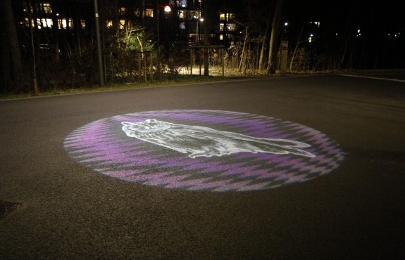 Waar in Beverwijk de cirkels dienen om mensen stil te laten staan, een plek om te verblijven, is dat in Kerckebosch juist niet zo. Als je daar in het licht gaat staan, sta je midden op straat. Kerckebosch is een prachtig boomrijke, meanderende wijk van Zeist met een toch al bijzonder lichtplan van rode straatverlichting. ‘De wijk is opgezet als de vijf vingers van een hand die in de omringende natuur steken, met als idee dat natuur en bebouwing vermengd raken.’ Aan de Kerckeboschlaan bedacht Van der Goot bij iedere ingang naar een woonscheg een projectie van een dier. Een dier dat zomaar in werkelijkheid, vanwege het passende leefklimaat, een soort buurman zou kunnen worden, zoals de vleermuis of de vos. ‘Omdat de tekeningen voor de bewoners gemaakt zijn, zien zij het dier rechtop als ze de Kerckeboschlaan naderen. Ik wilde graag dat het voor hen echt een herkenningspunt is en dat ze tegen hun bezoek kunnen zeggen: je moet bij de ransuil linksaf.’