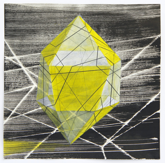 Veel van haar werk bestaat uit een drukbetekende achtergrond waarin steeds één grote vorm onze aandacht vraagt. Dat zijn mathematische vormen, prisma’s, oktaeders, hexaeders, zoals de mysterieuze namen van meetkundige veelvlakken luiden. Ze doen denken aan planeten die door het heelal van Lenneke van der Goot drijven. In gedachten zie je ze op hun vlucht kantelen en wentelen.
