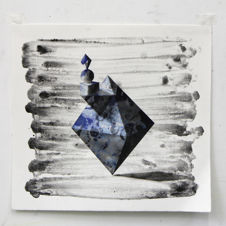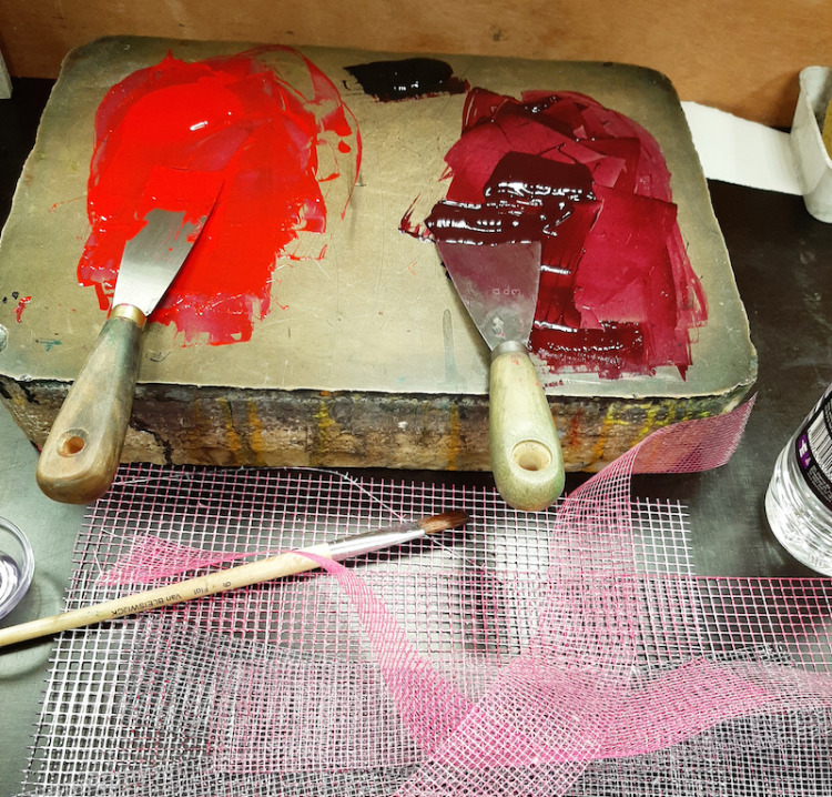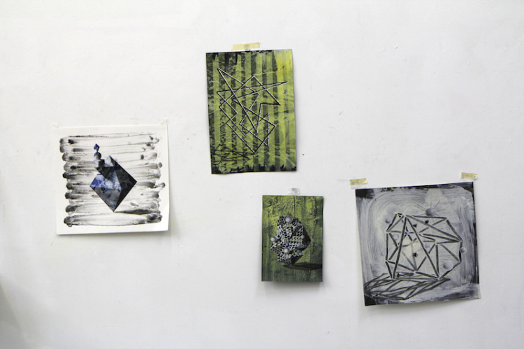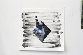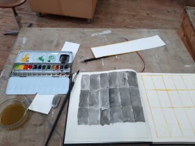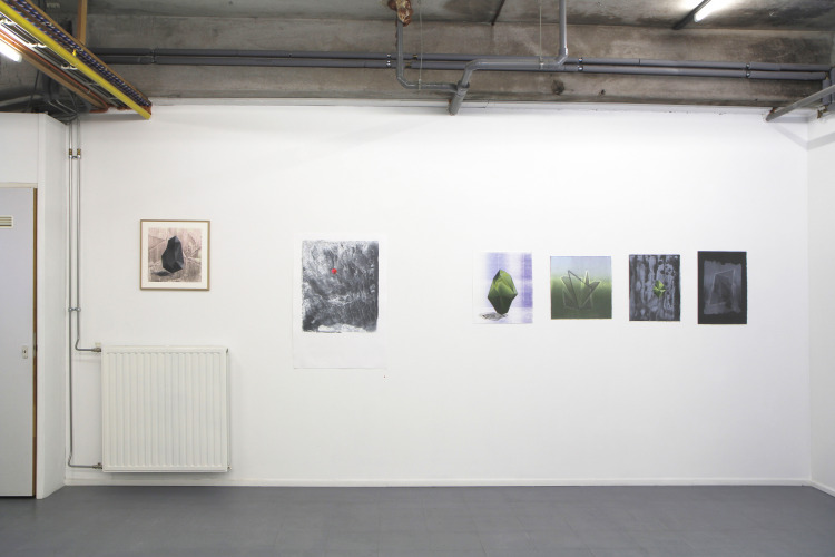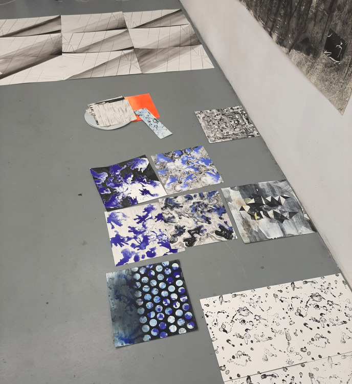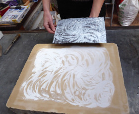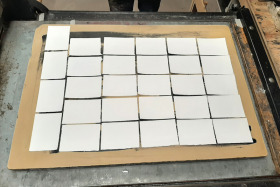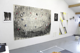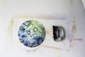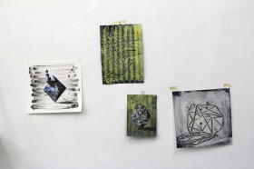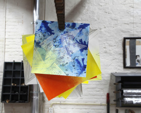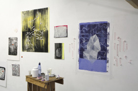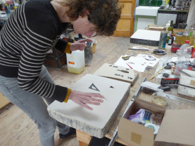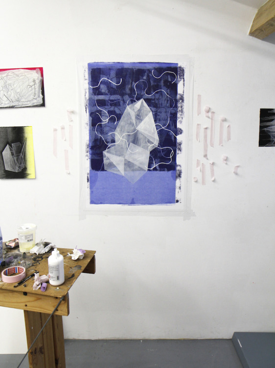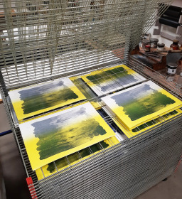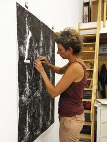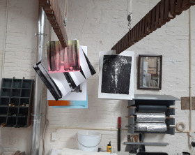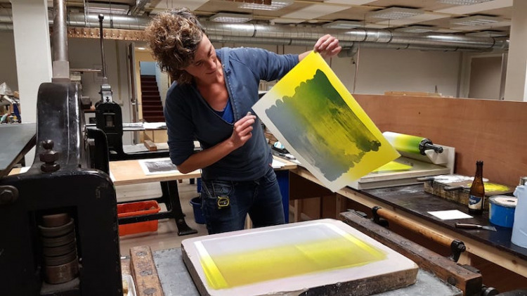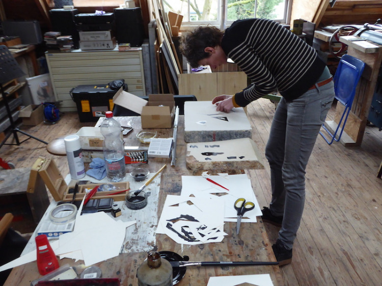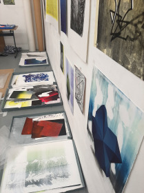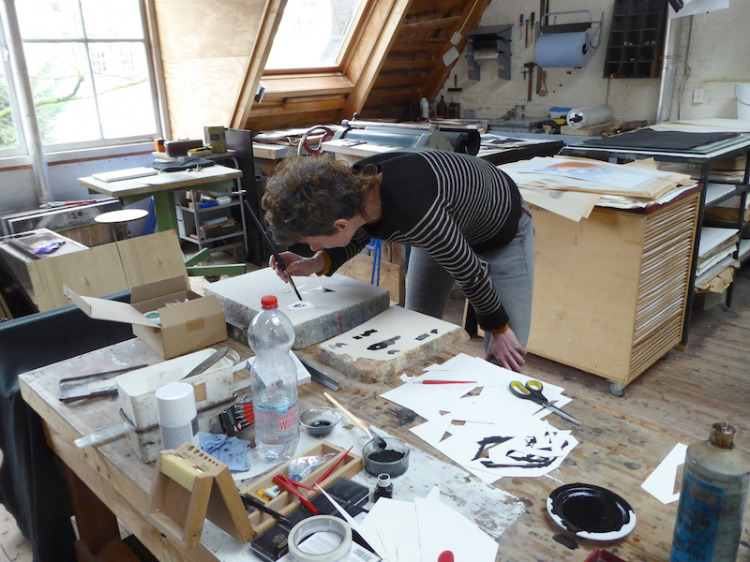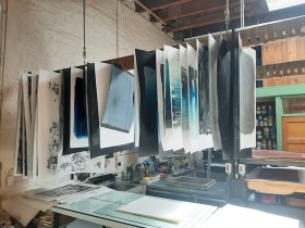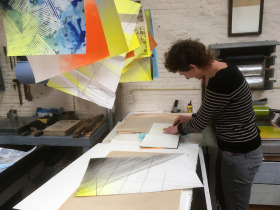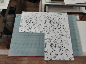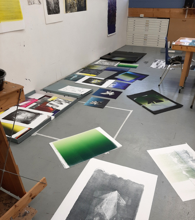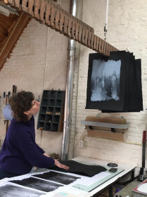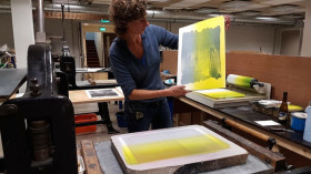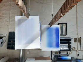 Wat erg prettig was, was dat ik in dezelfde ruimte kon werken, zoals in mijn eigen atelier, en kon steendrukken. Door mijn manier van werken, waarbij niet steeds een grote oplage wordt gedrukt maar ik aan soms een enkele durk al genoeg had, werden er aan de lopende band stenen geslepen en geprepareerd. Als in een snelkookpan vulden de droogrekken zich met experimenten. Sommige waren meteen raak, rijp om op door te werken. Maar er zaten ook miskleunen tussen, die op een later moment misschien verknipt zullen worden in ander werk of er helemaal niet meer toe zullen doen.