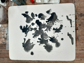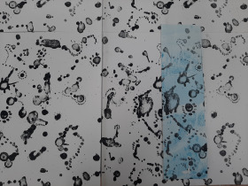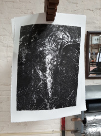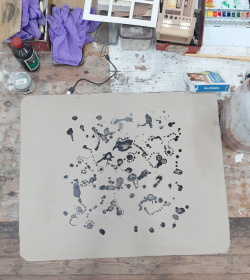 Een vlekkensteen. Het klinkt makkelijker dan het is. De steen waaraan ik werkte droogde totaal anders op dan verwacht. Nog een laag eroverheen dan maar, eigenlijk moet je dan eerst je beeld weer verwijderen, maar een beetje extra beeld kon in dit geval geen kwaad. Versie twee werd ook totaal anders. Wat nu? Als niks wordt zoals je had bedacht kan je net zo goed de situatie aangrijpen om iets totaal anders uit te proberen. Wat als je de steen helemaal laat vollopen met inkt? En dan toch afdrukken? Resultaat: een prachtig gelaagde serie in zwart, allemaal anders. Een mooi begin, maar of we dit nog eens na kunnen doen is de vraag. Eerst maar eens aan de slag met deze halffabricaten.