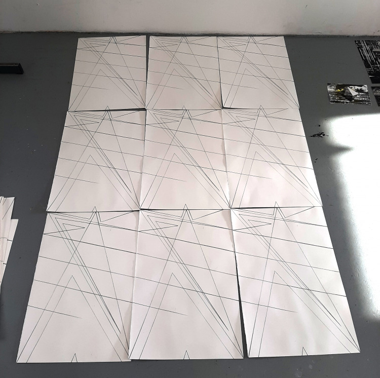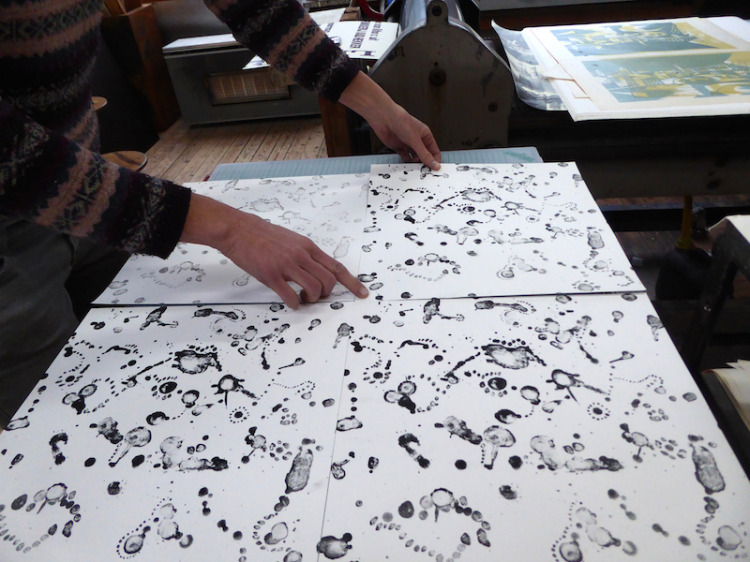 Om groot formaat litho-tekeningen te kunnen maken, combineer ik verschillende vellen die als een soort puzzel worden samengevoegd tot een geheel. We drukken op 40 x 60 cm, dat is op een steen die je al niet meer kan tillen. Zwaar werk dus. Negen van deze vellen moeten samen één werk gaan vormen.