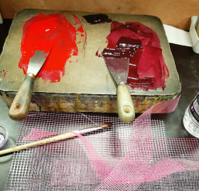 Aanvankelijk heb ik veel met zwart gedrukt. De nuances en contrasten in de zwarte drukinkt zijn ontelbaar en onuitputtelijk. Maar de hoge kast in de hoek lonkte. Die staat namelijk helemaal vol met blikken litho-inkt. Met namen zoals 'Soleil' en 'Azure' en verleidelijke oorden zoals 'Orange de Java'. Als je de deksel openwrikt schijnen de meest fantastische kleuren je tegemoet, maar dat zegt nog niks. Door de inkt met je vinger op een papiertje te tippen, zie je de daadwerkelijke kleur verschijnen, zoals die eruit ziet als je ermee gaat drukken, vaak heel anders dan hoe die oogt in het blik. Niet te weerstaan die kast, dus ik besloot met kleur te gaan drukken, eens proberen. Het bleek heel waardevol om over reeds bestaande tekeningen heen te drukken. Mijn ladekast waar 'beginnetjes' in liggen was een uitkomst. Sommige werken lagen al jaren te wachten op een vervolg. Dit was een uitgelezen kans.