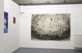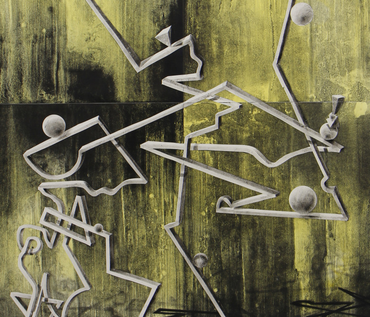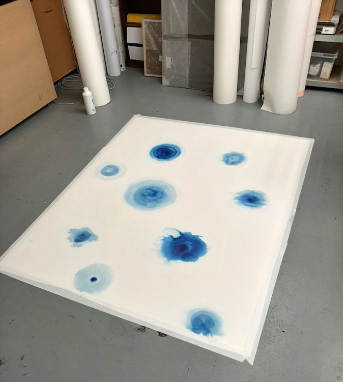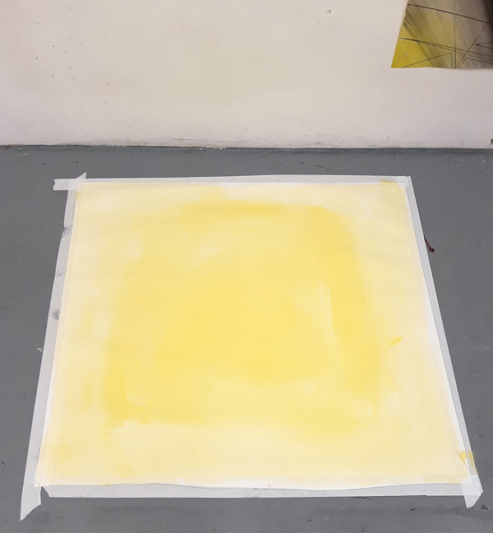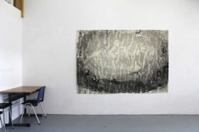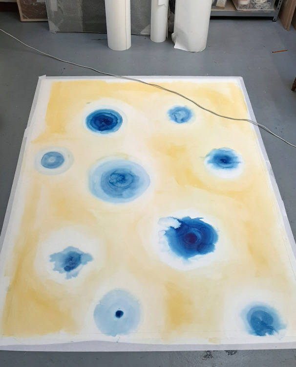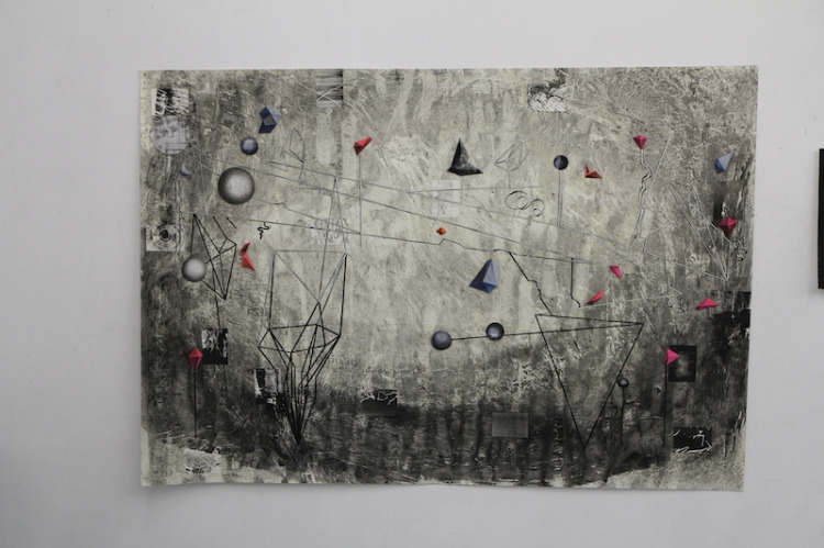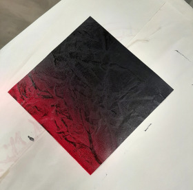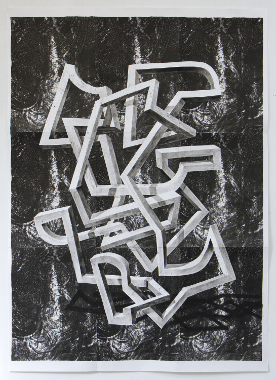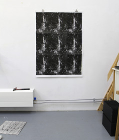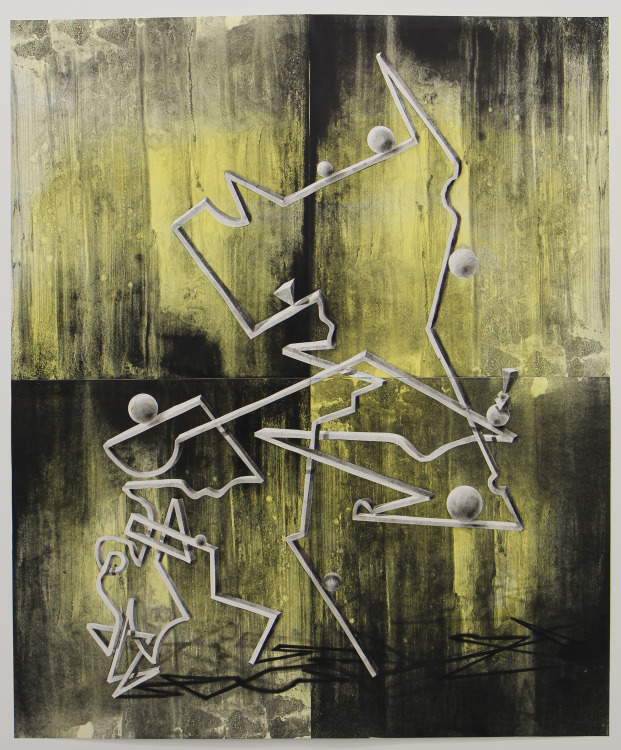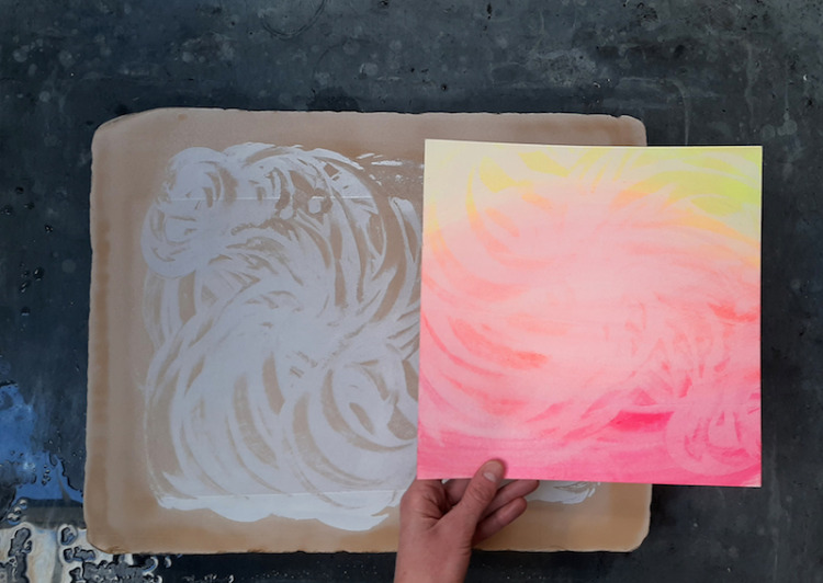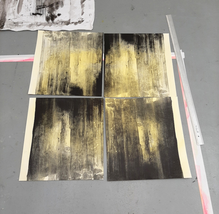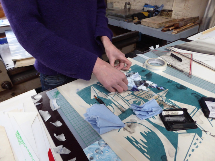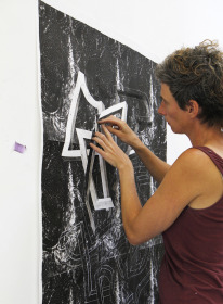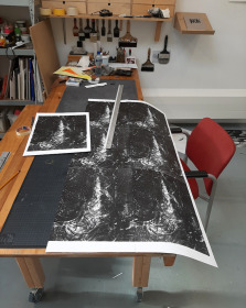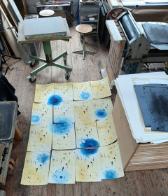 Voor dit werk heb ik een relatief groot vel geprepareerd in mijn atelier. Omdat dit te groot was voor onder de pers heb ik eerst de tekening in vier stukken gesneden, om het vervolgens te drukken. Na het drukken heb ik de vier delen weer aan elkaar bevestigd en in mijn atelier voorzien van een laatste laag.