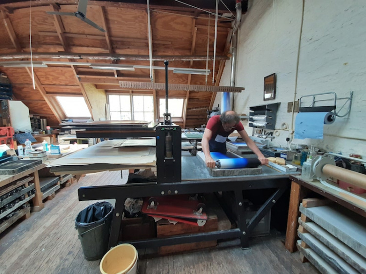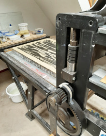 Door Corona veel later dan gepland, bracht ik in de zomer twee keer een werkbezoek aan de steendrukkerij Basement Press Diepenheim van een aantal dagen. Anders dan in Steendrukkerij Aad Hekker heb je hier volop de ruimte. Ik heb de artist in residence gebruikt om met name groot te drukken. Het formaat 70 x 100 cm bleek het maximaal haalbare op dat moment, voor een groter formaat waren wel stenen voorradig, maar geen rollers, gladdekkers of een rijver.