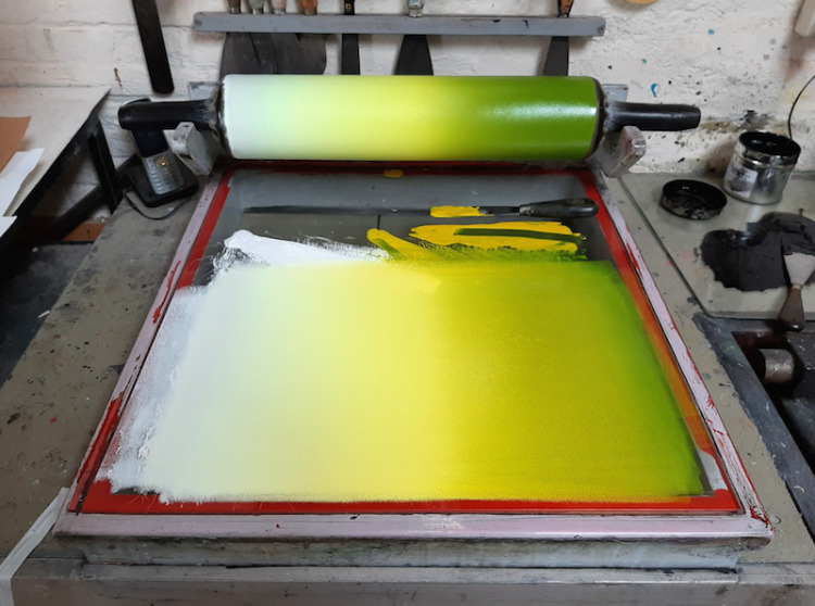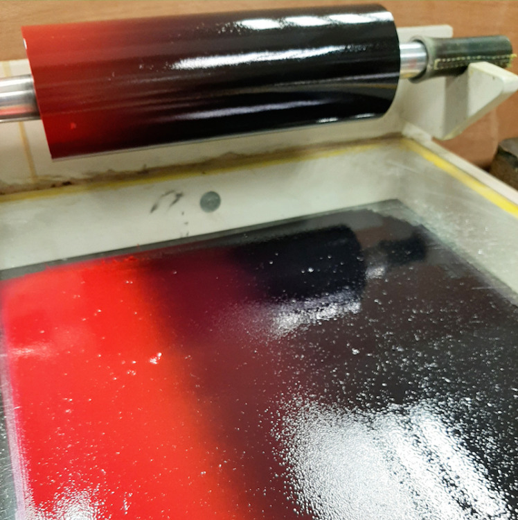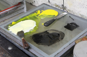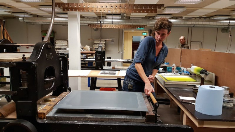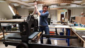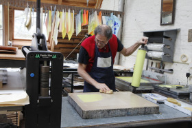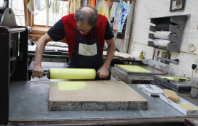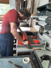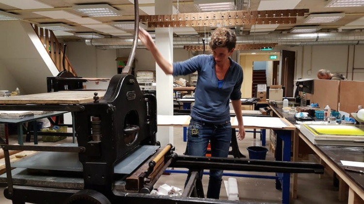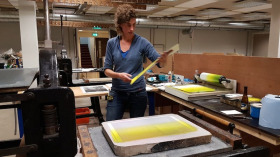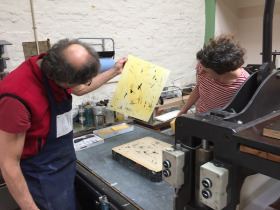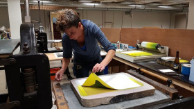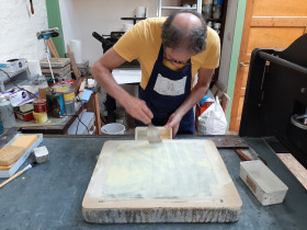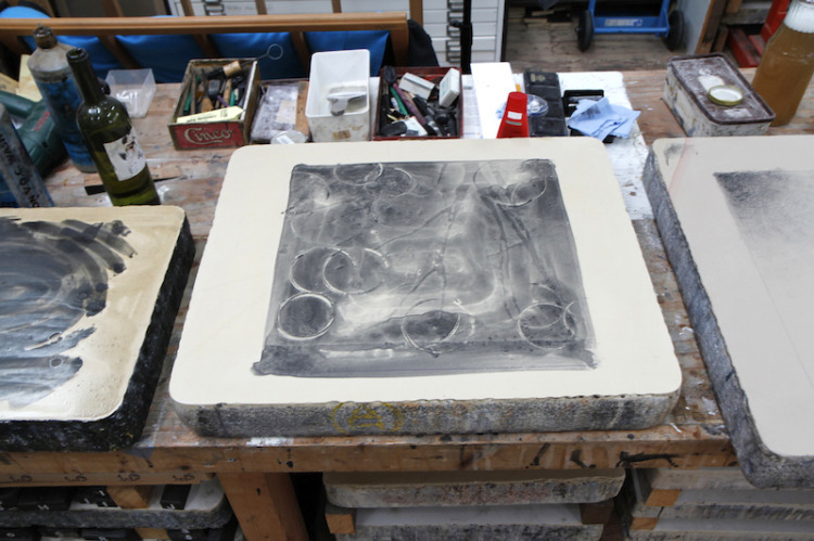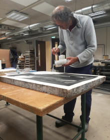 Aan de slag in Steendrukkerij Aad Hekker. We prepareren een paar stenen. Waar begin je? Eerst maar even warmdraaien.
