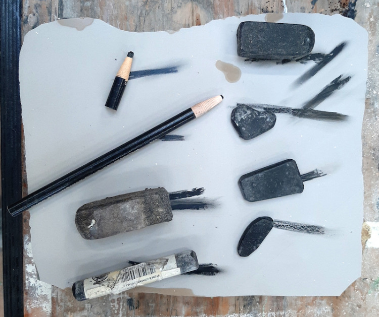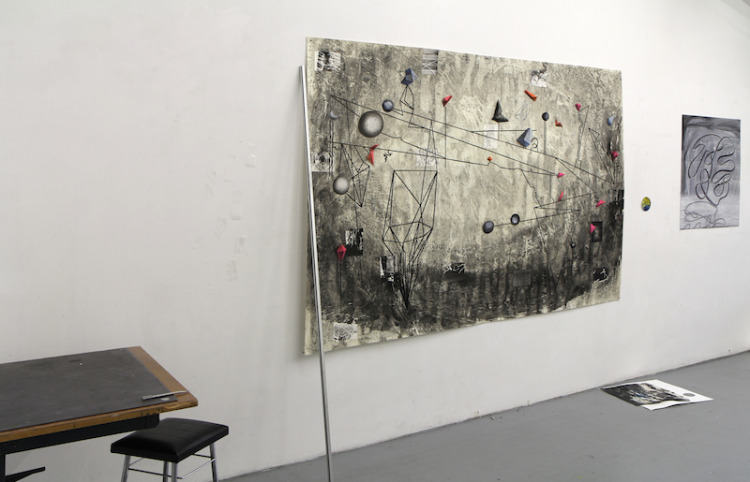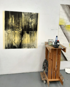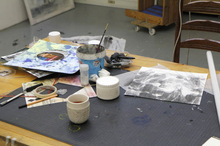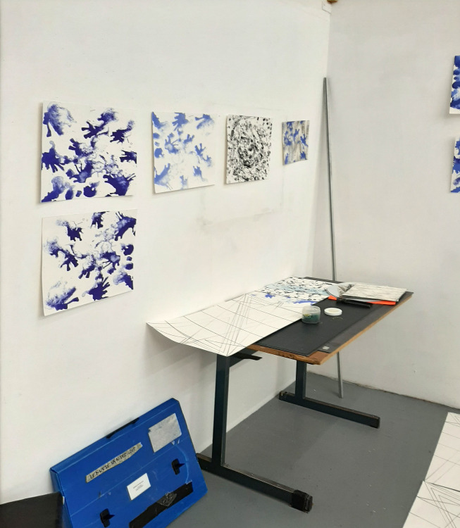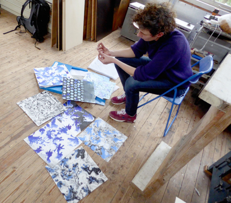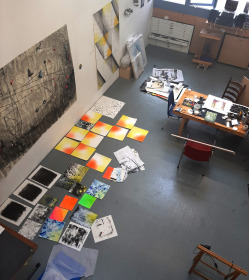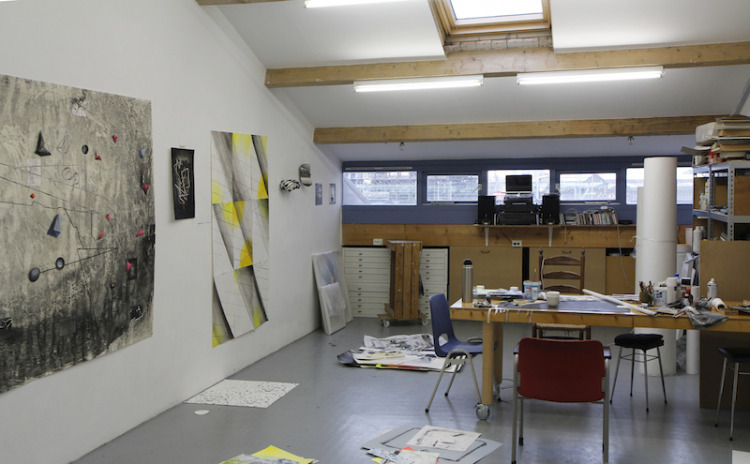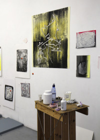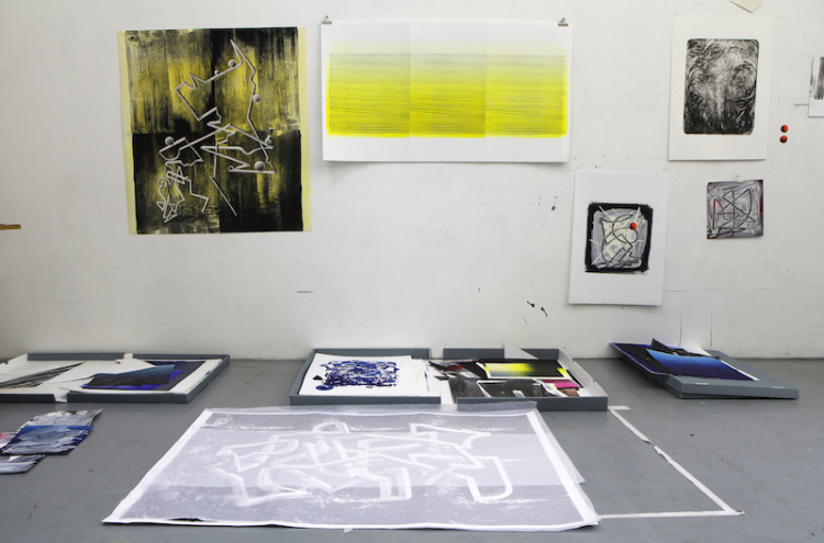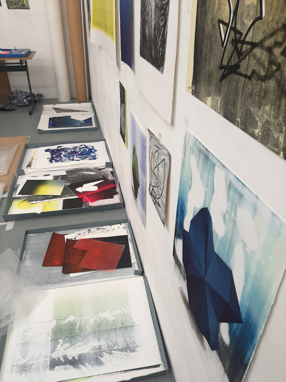 Tekenen op litho's: in mijn atelier heb ik nu een heleboel lithografisch materiaal waar ik op door kan werken.