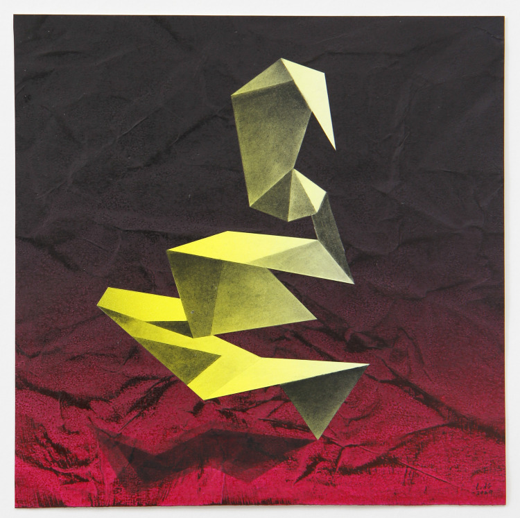 Wat je ziet is een dubbel gedrukte litho. Vandaar ook de titel 'Double Silhouette'. Maar daarbij is het papier bij de tweede druk omgedraaid. En omdat puur en alleen een vorm omgedraaid 'dubbelen' meestal niet zo'n spannend beeld oplevert, is een deel van de vorm na de eerste druk weggeslepen van de steen. Je ziet dus een complete tekening, met daaroverheen, gedraaid, dezelfe maar dan aangepaste tekening. Dit soort ingrepen teken ik niet van te voren uit. Het is dus een beetje een gok of het wat wordt. Ook kun je bij de tweede druk niet precies zien hoe je je vel neerlegt, de afbeelding zit tenslotte aan de onderkant als je het vel op de steen legt. Hier pakte het wonderwel goed uit, met dank natuurlijk aan de vaste en kundige hand van meesterdrukker Aad Hekker. Het lijkt wel of hij door het papier heen heeft kunnen kijken.