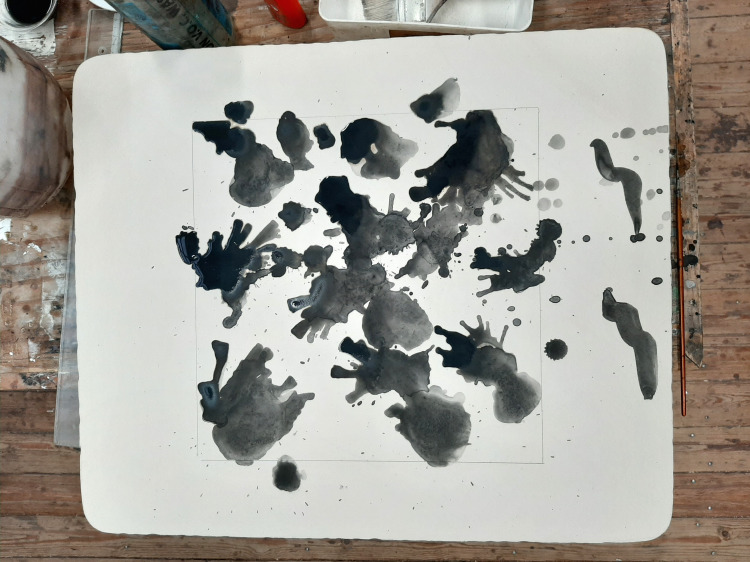 In 2018 begon ik al aan deze tekening. Hij is opgebouwd uit vele lagen inkt op een lichtgele ondergrond. Kleine rechthoekige inkttekenigen zijn in de achtergrond gemonteerd, als een soort vensters. Ze versmelten net niet met de omgeving waardoor kleine fricties onstaan, maar soms ook beeldrijm of reacties.