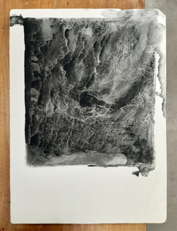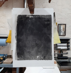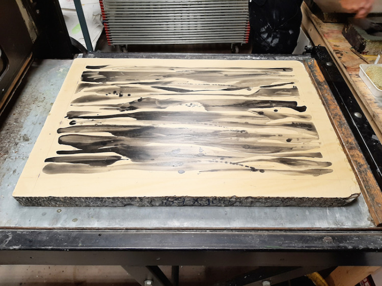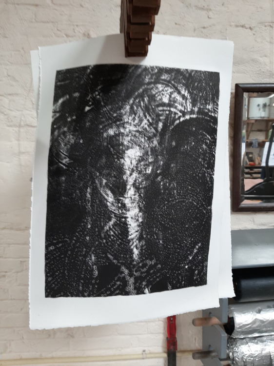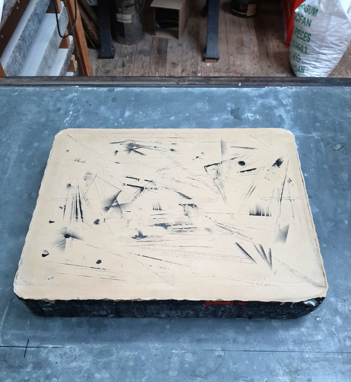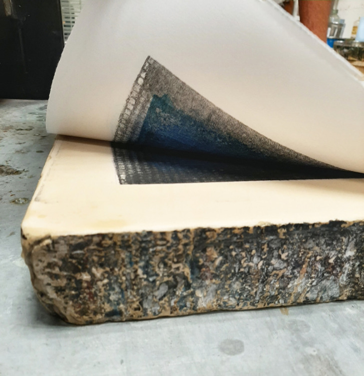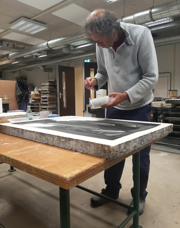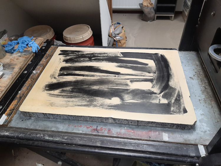 De kolkende bewegingen die door het wrijven ontstonden hebben we laten opdrogen en de steen geprepareerd zoals het hoort. Bij het drukken zagen we de steen langzaam vollopen, maar het beeld was niet onaangenaam. Snel een kleine oplage drukken voordat het beeld volledig zou zijn volgelopen en de steen overal inkt zou aannemen. Negen litho's waren voldoende.