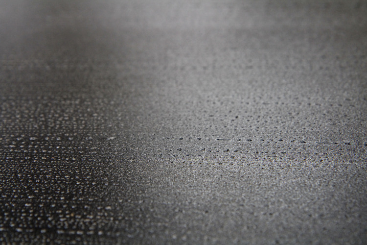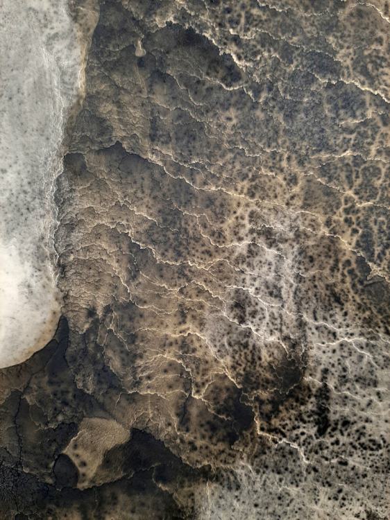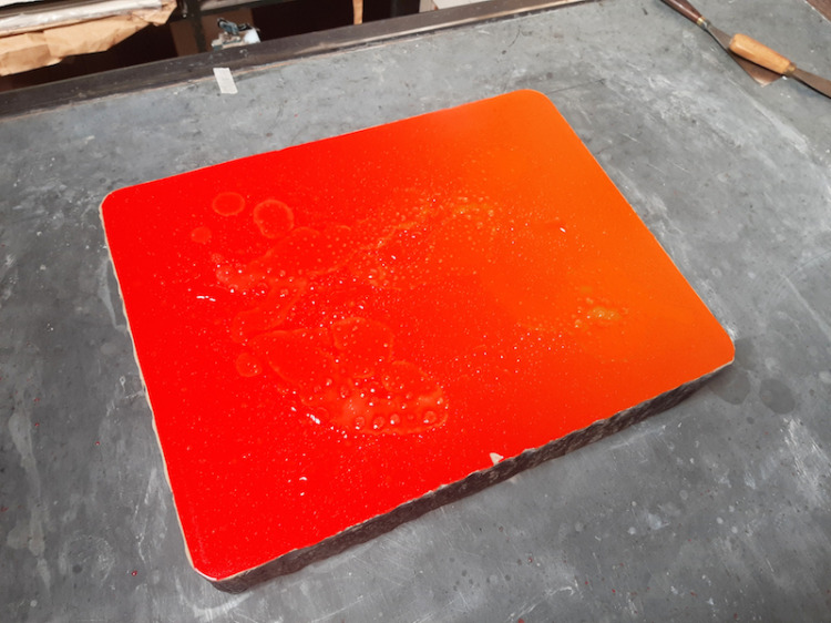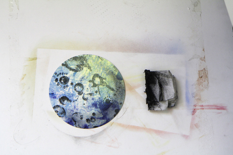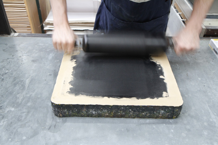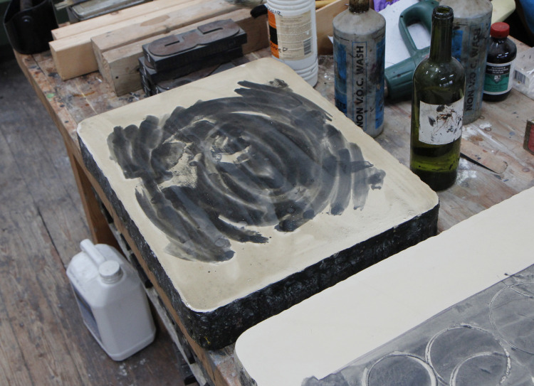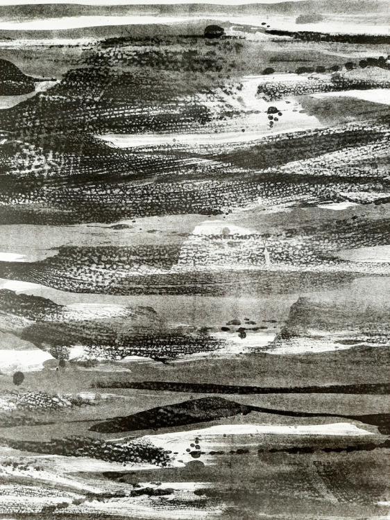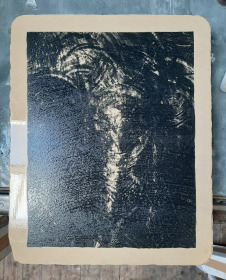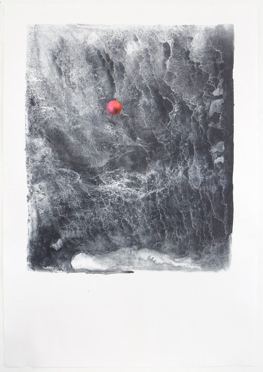 De kolkende bewegingen die door het wrijven ontstonden hebben we laten opdrogen en de steen geprepareerd zoals het hoort. Bij het drukken zagen we de steen langzaam vollopen, maar het beeld was niet onaangenaam. Snel een kleine oplage drukken voordat het beeld volledig zou zijn volgelopen en de steen overal inkt zou aannemen. Negen litho's waren voldoende.