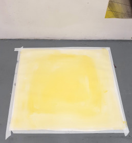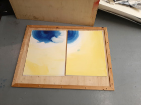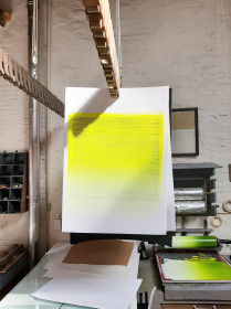 Gedurende het project heb ik heel wat irisdrukken gemaakt. Het verloop in een irisdruk is zo prachtig regelmatig, er ontstaan zoveel kleuren, ik vind het betoverend om naar te kijken. In dit werk heb ik slechts met wit en geel gewerkt met vele tussengelen tot gevolg. De lijnenlitho zit onder het kleurvlak, waardoor ook elke horizontale lijn weer een eigen toon heeft gekregen. Ik heb dit werk al een tijd in mijn atalier hangen, maar het gaat niet vervelen. Doordat het een samengesteld beeld is, de tekening bestaat uit meerdere vellen, doen alle snijvlakken tussen de vellen ook mee. Deze subtiele raakvlakken zijn eigenlijk vooral door de schaduwwerking zichtbaar. Maar ook doordat de horizontale lijnen net niet aansluiten. De ruimte die erin zit heeft eigenlijk niets meer nodig dan een dwalende blik. Misschien laat ik hem zo.