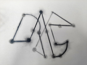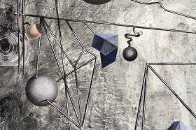 De tekening heet 'Parcours'. Een ruimtelijke lijn beweegt zich over het vlak en kronkelt zichzelf steeds bijna in de knoop maar weet ook weer te ontsnappen. Kleine objectjes in de vorm van ballen, piramides en veelvlakken balanceren op de lijn. Als een soort magneetjes kleven ze aan het parcours, je kunt je voorstellen dat ze van plek kunnen evranderen.