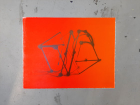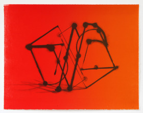 In een zacht zwart krijt heb ik de getekende figuur opgetrokken. Het is een soort ruimtelijk lijnenspel, afgewisseld met bollen, veelal op de kruispunten. De tekening is een beetje vaag, onscherp lijkt het. Alsof hij gedeeltelijk is uitgegumd. Of komt het omdat je wordt verblind door het felle rood-oranje licht dat je tegemoet schijnt. Licht kun je niet tekenen, maar het benaderen is uitdagend genoed en soms krijg je het gevoel dat je heel dichtbij bent gekomen, zoals in dit werk.