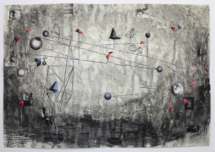 In plaats van een groot object of vorm te plaatsen, besloot ik in dit werk juist een constructie neer te zetten die bestaat uit allemaal dunne verbindingen, een soort ruimtelijke tekening. Een beetje wankel moest ie zijn en een beetje wispelturig. Met duidelijke rechte lijnen maar ook kronkels en uitschieters. Op de constructie heb ik verschillende kleine en grotere objecten geplaatst. Sommige lijken op elkaar, aderen zijn afwijkend. Nadat de tekening een tijdlang op rol had gestaan in mijn atelier en ik hem eindelijk weer op had gepakt en lekker aan het werk was, brak Corona uit. Het litho-project kwam tot stilstand en tentoonstellingen werden uitgesteld of verplaatst. Ik besloot verder te gaan aan dit werk en door de hele situatie waar we inzaten viel opeens alles op zijn plek. De titel 'Overloaded System' ontstond, dat ik voor zowel dit werk als de maatschappelijke situatie erg toepasselijk vond.