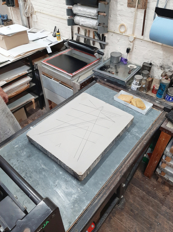 Drukken over een tekening heen, dat was een van de dingen die ik wilde uitproberen tijdens dit project. Ik werk graag op verschillende formaten, van klein (ansichtkaartformaat) tot muurvullend. Litho leent zich alleen niet zo goed voor groot. Een kleine steen is al bijna niet te tillen, je werkt in de steendrukkerij om die reden met karretjes die je omhoog en omlaag kunt draaien, om de steen telkens op het betreffende werkblad te kunnen duwen. En tijdens het werk wordt de steen vaak verplaatst. Van de slijpbak naar de tekenktafel, naar de pers en weer naar de slijpbak.